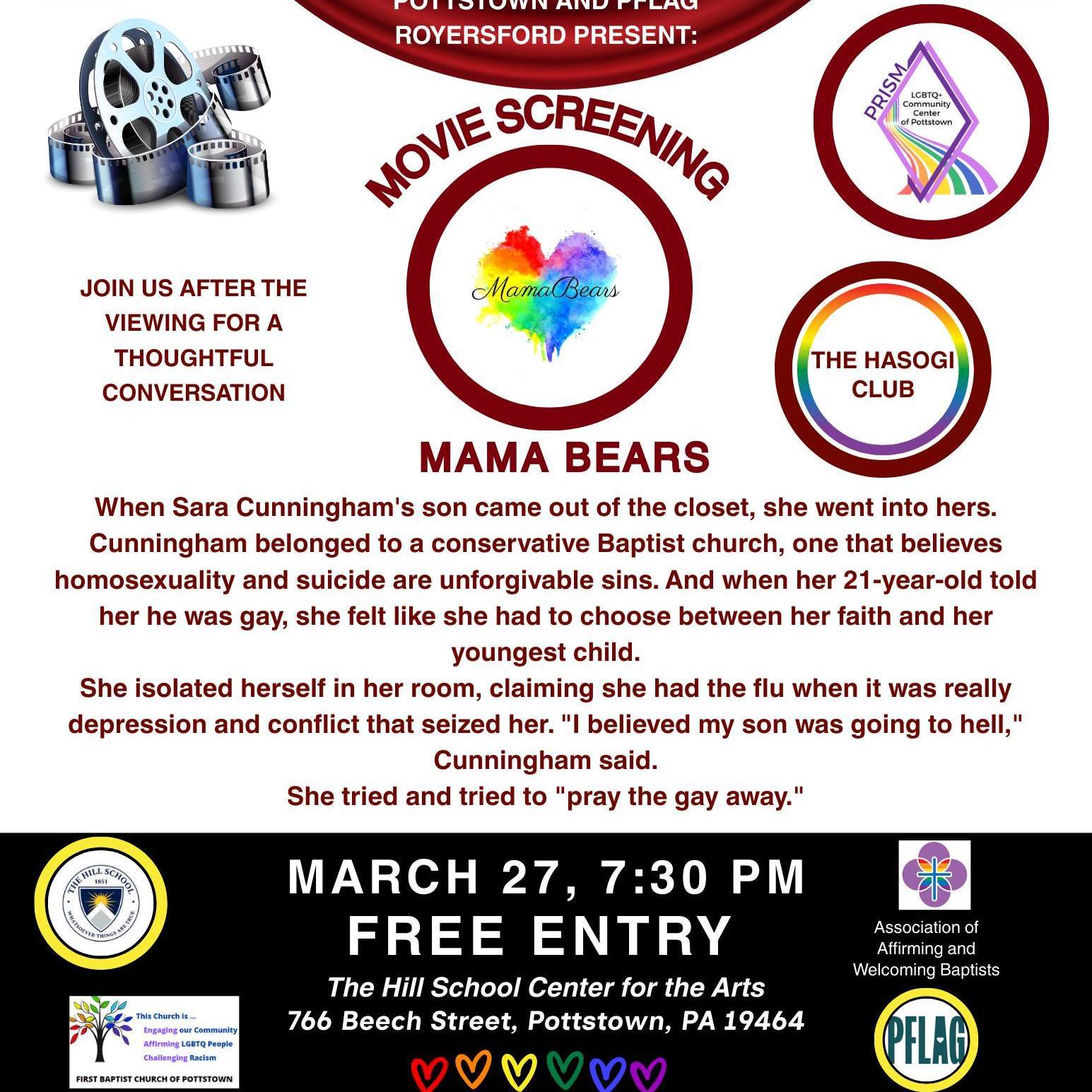 The public is invited to attend a free screening of the documentary “Mama Bears” on Friday, March 27 at 7:30 p.m. at The Hill School Center for the Arts in Pottstown.