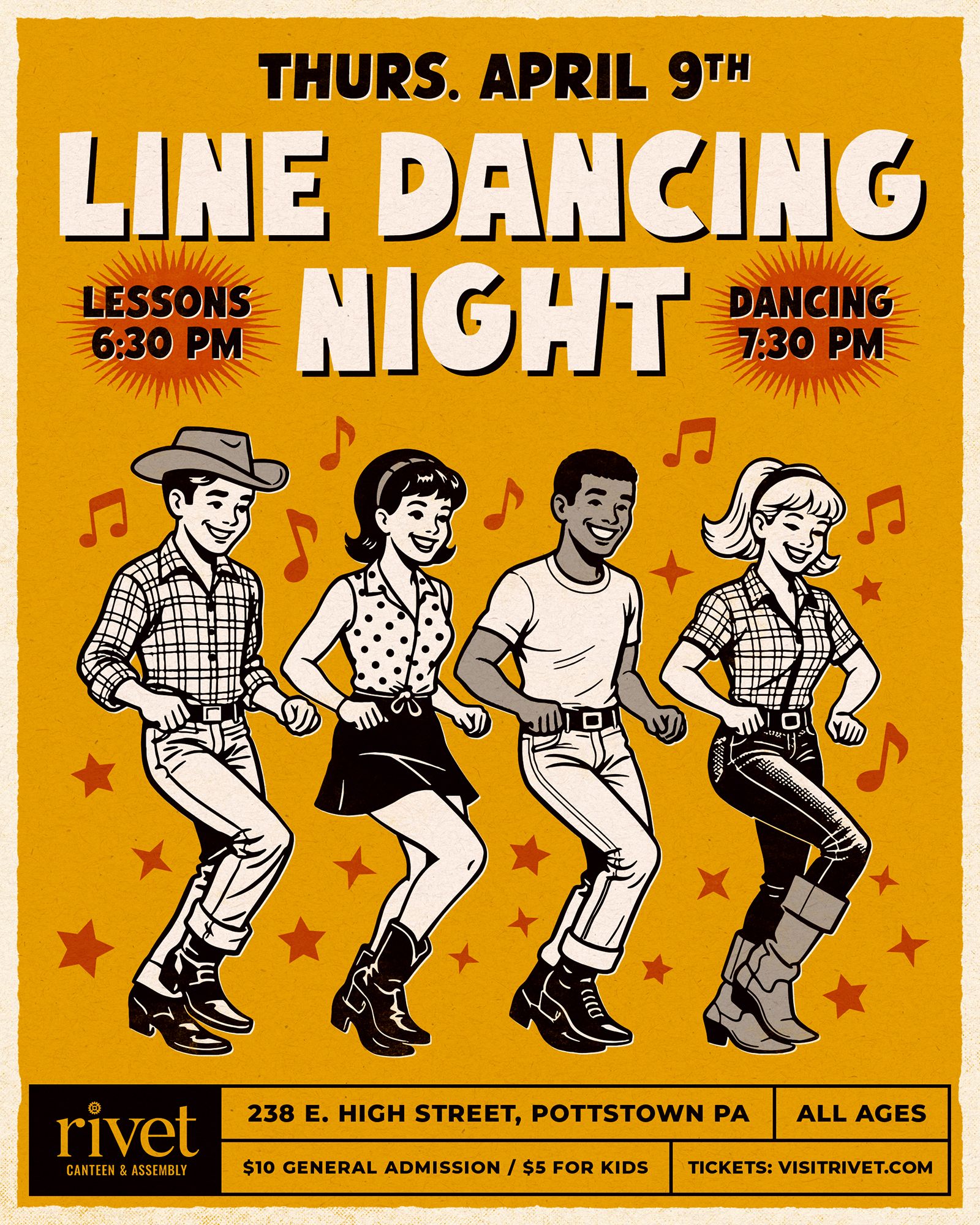 Rivet: Canteen & Assembly in Pottstown is bringing back its popular Line Dancing Night on Thursday, April 9, inviting guests of all skill levels to hit the dance floor.